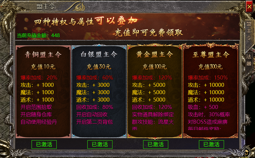 分为四种青铜 白银 黄金 至尊四大类,分别是充值10元 30元 100元 300元解锁。不通等级的盟主令有不等的收益,青铜开启范围拾取 随身仓库 自动使用经验丹。增加玩家物法道各1000攻击20%爆率。