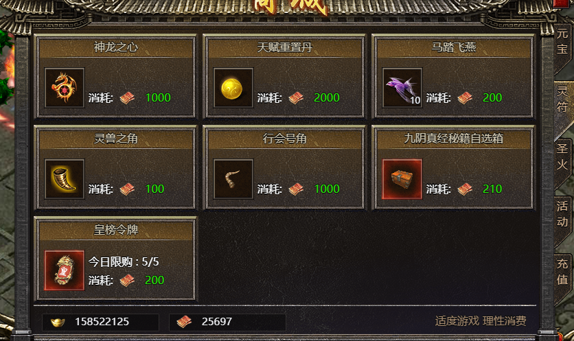 接下来就是皇榜令牌的来源,第一个就是在第三大陆以上的副本里击杀小怪或者boss有几率掉落,其次还可以在灵符商店最底层花200灵符购买,每日上限是5次购买机会