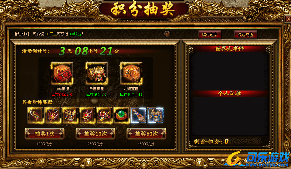 活动期间,开放积分抽奖活动,活动期间充值即可获得积分,可以使用积分进行抽奖,获得大量极品装备和珍稀道具!更有机会获得16转神装、传世神装、九转修为丹等超稀有道具!数量有限,先到先得喔!(温馨提示,传世神匣等你来拿!)