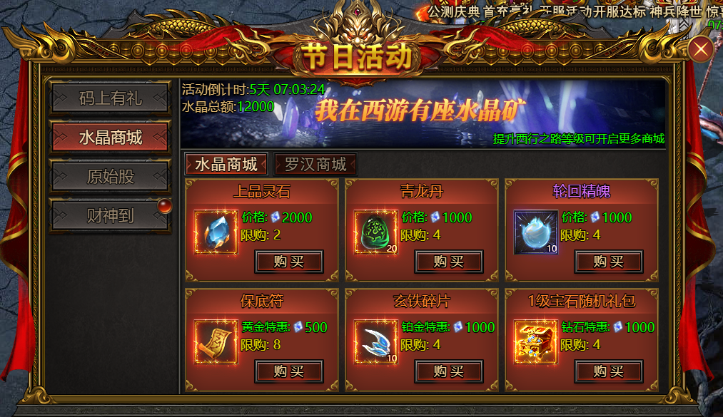 ² 使用水晶购买资源,初始只有水晶商城一个页签,根据西行之路等级逐渐开放,共四个