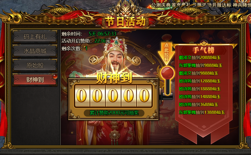 ² 根据玩家充值金额,获得抽奖次数,点击拉杆获得随机数额仙玉。活动期间最多可抽奖4次