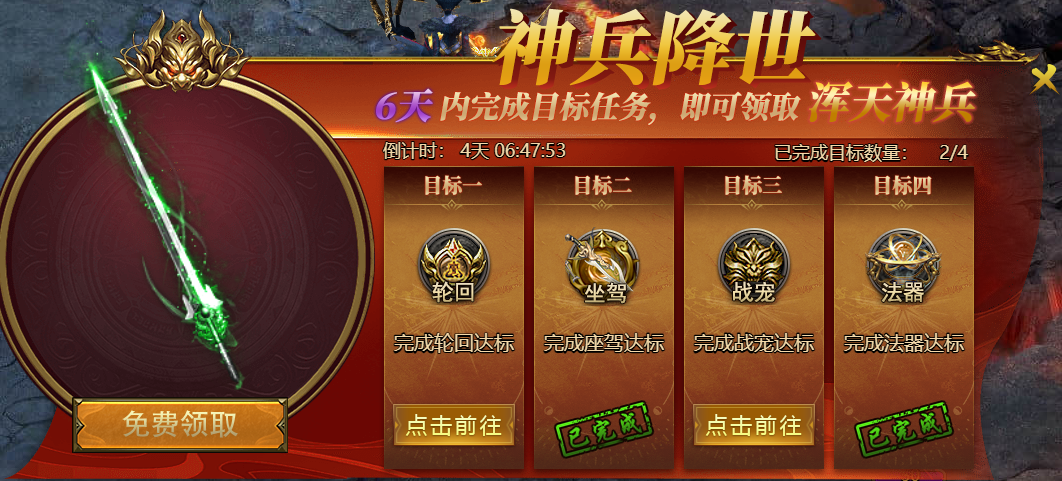 ² 完成任意达标后会开启神兵降世,神甲临凡。完成对应四个达标可免费领取神装