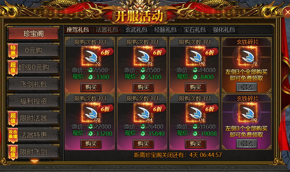 ² 开服前7天开放,共9档礼包,内容均为玄铁碎片和灵石