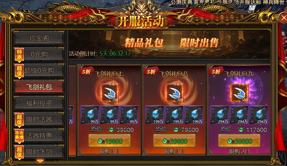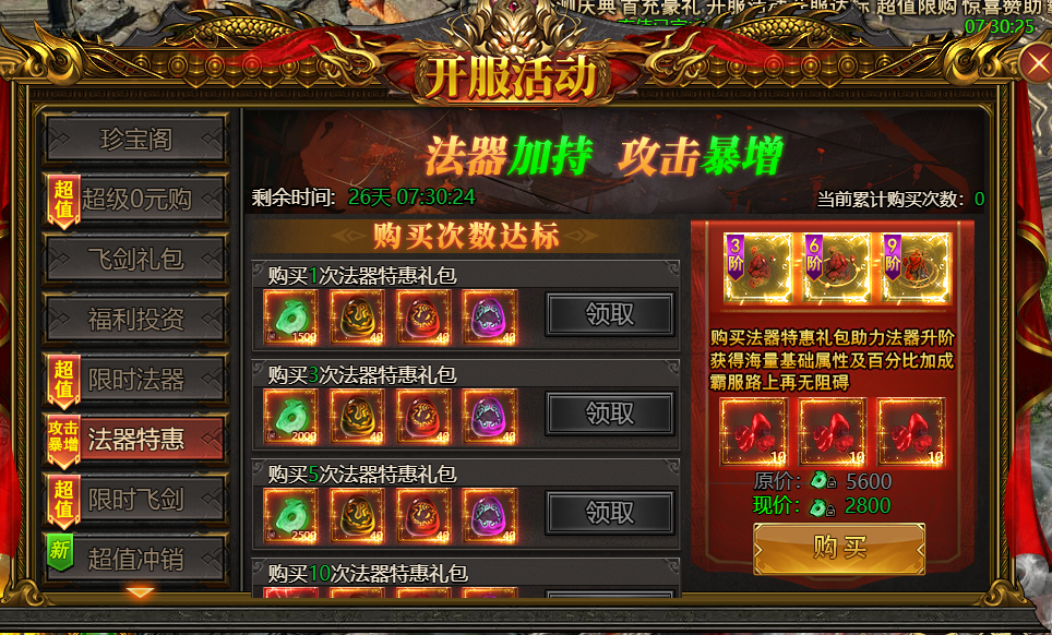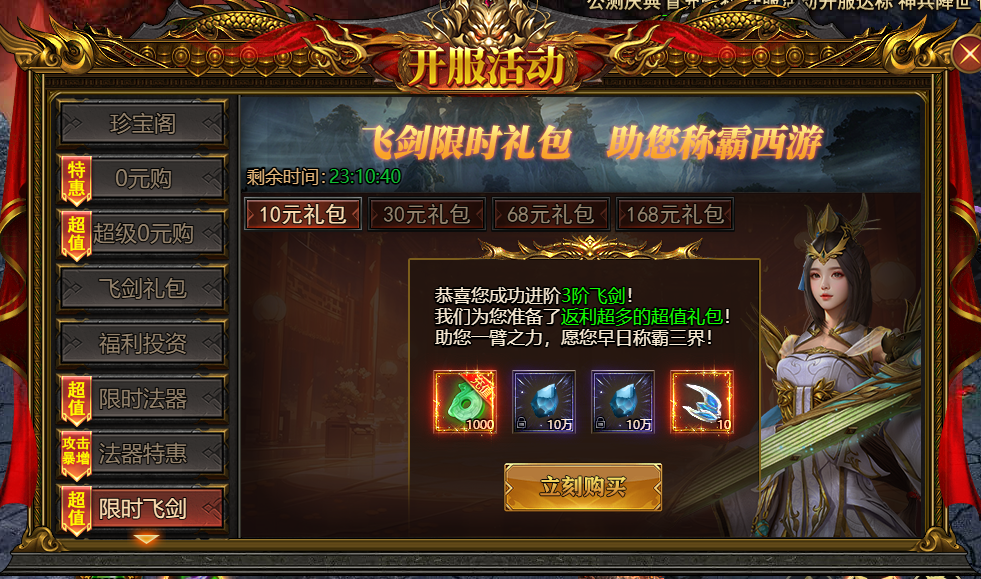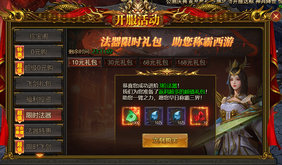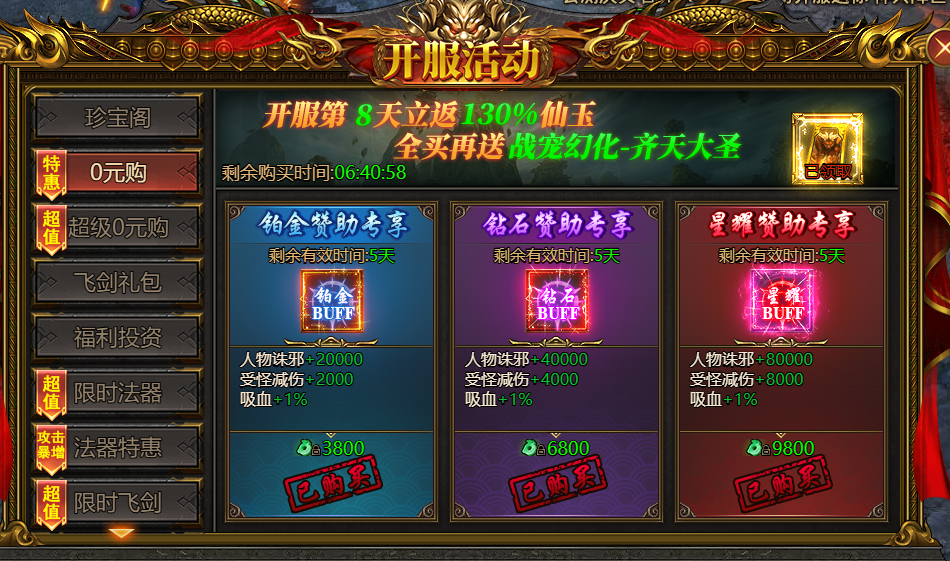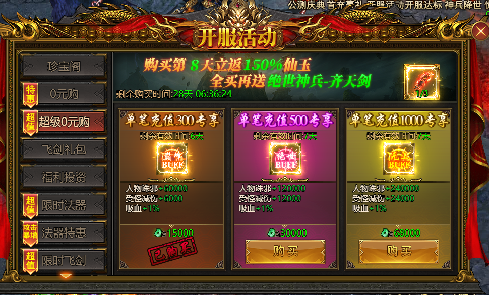 ² 购买三个buff后可免费领取神装齐天剑,满足条件未领取会通过邮件发送