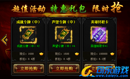 活动期间,可购买超优折扣每日限购礼包,英雄转职卡、印记灵魄、探宝符、羽毛、魂玉结晶、护盾结晶、暗器结晶、成就令牌、声望令牌等极品道具仅限活动期间跳楼优惠!
