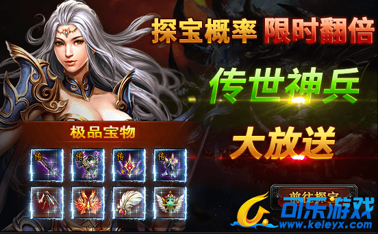 活动期间内,探宝概率翻倍;并有较大概率获得传世神兵、霸王神装、翅膀装备等极品道具!