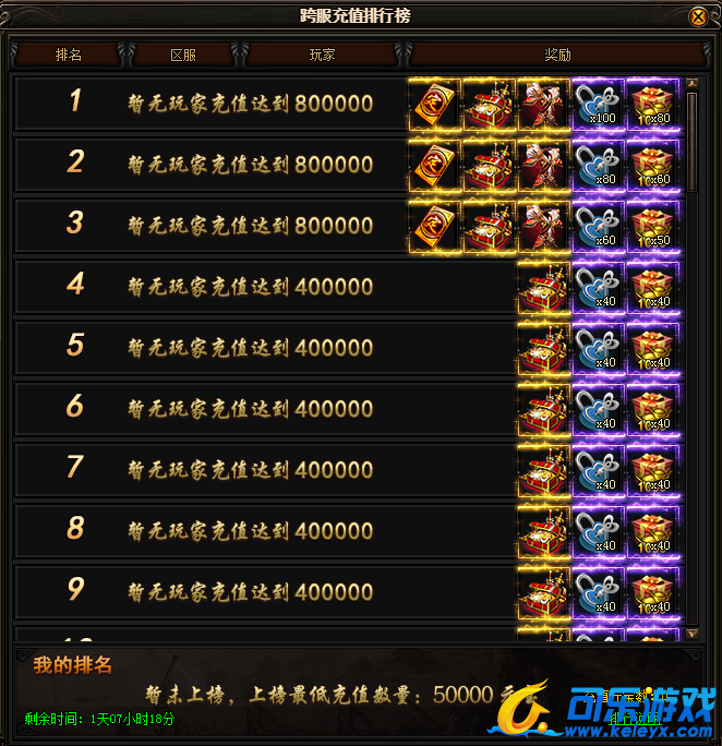 活动开启期间,玩家充值提前元宝数达到特定元宝即可登上平台充值排行榜对应位置,具体元宝数已展示在活动界面上;充值越多排名越靠前,提取数相同时按照时间顺序排列,活动结束时登上排行榜的玩家可获得精美道具。活动会在最后一日23:59:00秒开始统计结算,请玩家勿在最后一分钟充值,有可能不统计。(注:因数据量较大,排行榜刷新和奖励发放可能会约有10分钟的延迟,请大家谅解。)