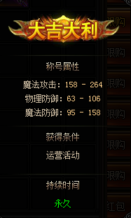 活动期间,购买限购礼包赢取幸运大奖,奖励极品限时称号。(全服限量买到即赚到)购买礼包越多,中奖几率越大!