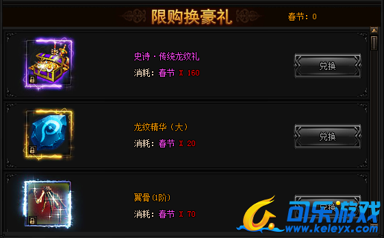 活动期间内,进行幸运探宝有一定概率获得春节。可以使用春节兑换下列极品奖励!