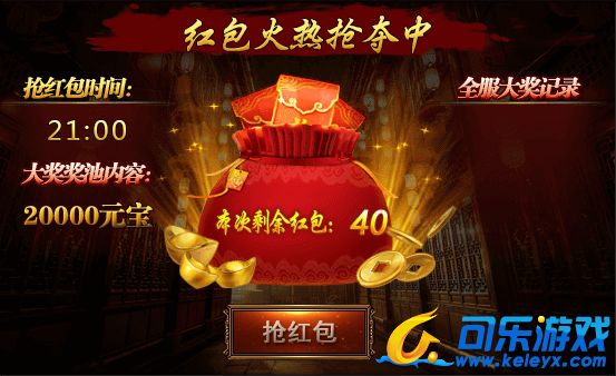 活动期间内,每天21点可抢新春红包!每人可抢10个红包,红包抢我全服必出一个大奖!