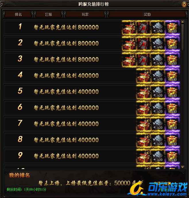 活动开启期间,玩家充值提前元宝数达到特定元宝即可登上平台充值排行榜对应位置,具体元宝数已展示在活动界面上;充值越多排名越靠前,提取数相同时按照时间顺序排列,活动结束时登上排行榜的玩家可获得精美道具。活动会在最后一日23:59:00秒开始统计结算,请玩家勿在最后一分钟充值,有可能不统计。(注:因数据量较大,排行榜刷新和奖励发放可能会约有10分钟的延迟,请大家谅解。)