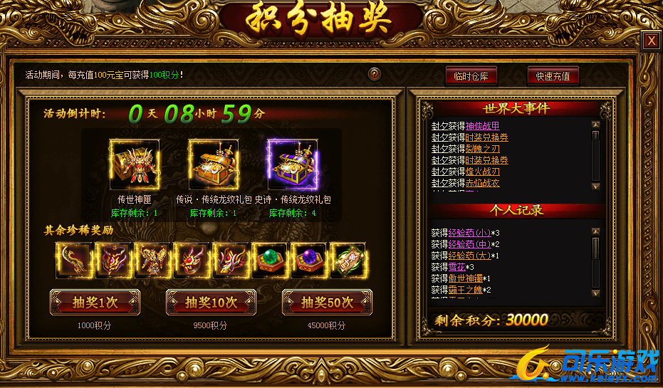 活动期间内,每充值100元宝即可获取100积分。(温馨提示:活动结束前,记得把积分消耗完毕。)