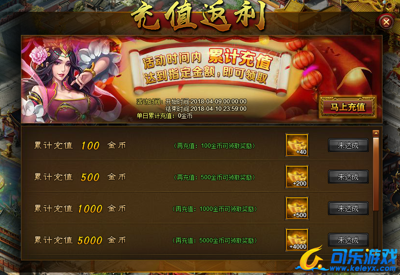 活动内容:活动期间单天充值达到指定金额即可领取丰厚元宝返利。