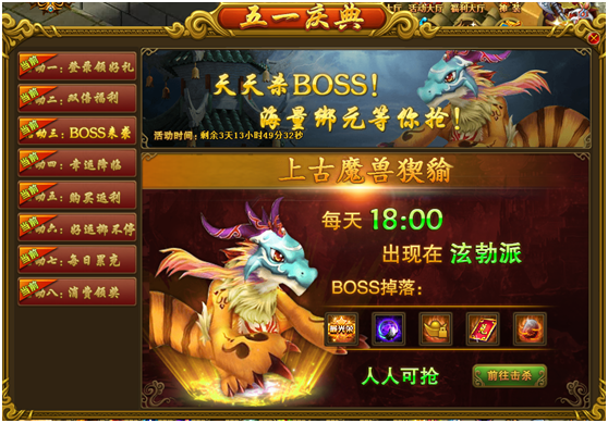 活动规则:活动期间,每天18:00都会在泫勃派出现boss,击杀可掉落相应奖励。