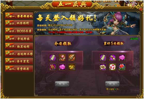 5. 第五天登录即可领取:50绑元、副本卷轴*3、至尊九转丹*1、至尊千年雪参*1、4千历练值*1、1千亲密度卷轴*1;