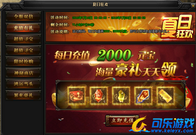 活动说明:活动期间,每日充值满2000、20000元宝!还能领取超值豪华大礼