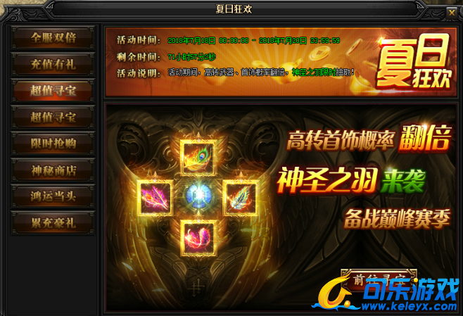 1,活动说明:活动期间,高转武器、首饰概率翻倍,神圣之羽限时抽取!