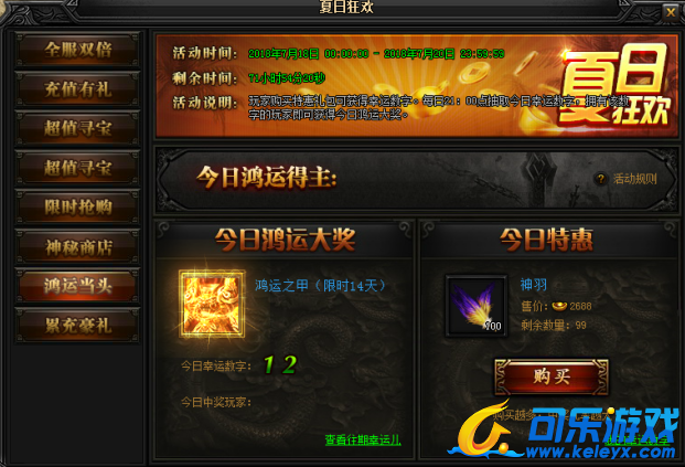 活动说明 : 玩家购买特惠礼包可活动幸运数字。每日21:00抽取今日幸运数字,拥有该数字的玩家即可获得今日鸿运大奖。