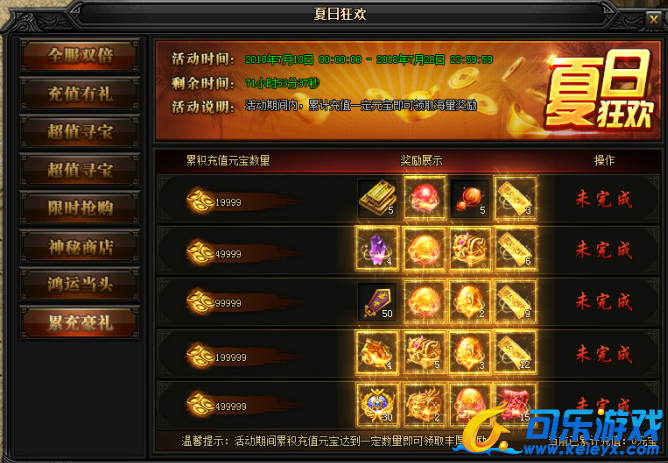 活动说明 : 活动期间内,累计充值一定元宝即可领取海量奖励。