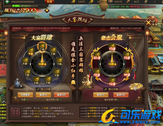 l 活动期间,每日有一次免费大宴群雄宴请机会。