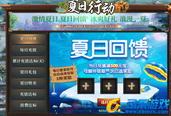 l 当日充值满500元宝,可额外领取一次已选奖励。