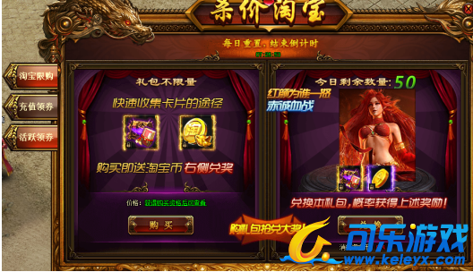 活动开启期间,参与充值领券或者活跃领券后,能获得杀价牌,可以在淘宝限购中进行砍价来降低礼包价格,该价格全服共享。如果礼包价格已经被砍到最低,则无法继续砍价,但是在消费购买礼包时,能优先扣除杀价牌来抵消元宝花费个人砍价次数越高,购买的道具越容易触发“双倍”奖励。该活动每天0点会进行重置。