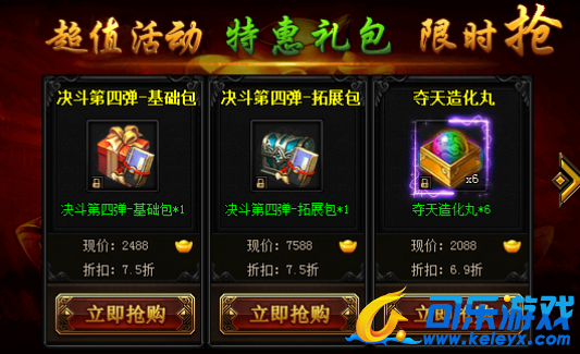 活动期间,可购买超优折扣每日限购礼包,神戒结晶、中级属强丹、传承之力、龙纹精华、印记灵魄、探宝符、羽毛、魂玉结晶、护盾结晶、暗器结晶、成就令牌、声望令牌等极品道具仅限活动期间跳楼优惠!