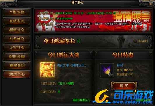 活动说明 : 玩家购买特惠礼包可活动幸运数字。每日21:00抽取今日幸运数字,拥有该数字的玩家即可获得今日鸿运大奖。