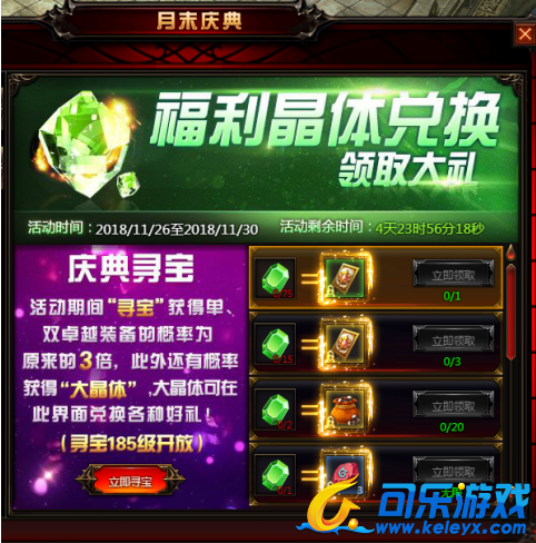 活动内容:在活动时间内,“寻宝”可获得单、双卓越装备的概率为原来的三倍,此外还有概率获得“大晶体”,大晶体可在月末庆典专属页面中兑换好礼,等你来拿!