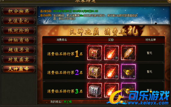 2. 活动期间内,累计消费满300000钻石即可参与排行,排行前3名的玩家可免费领取高级武器/灭神首饰箱、焚天异火、海量元宝等海量豪礼