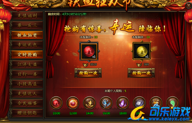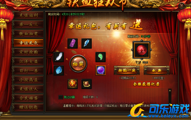 活动期间,每购买一次右侧礼包可获得一次抽奖机会;礼包2小时随机刷新一次,也可花费元宝进行刷新;每个礼包限购10次,每天0点重置抽奖次数和奖品可购买次数,有抽奖机会的兄弟请抓紧时间。
