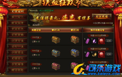 活动期间,充值相应元宝,即可在界面右侧领取对应的每日充值奖励。连冲更有好礼相送。