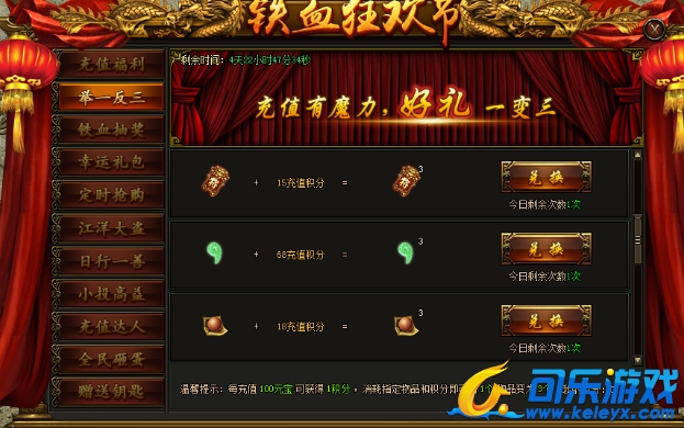 活动期间每累计充值100元宝即可获得1点充值积分;通过消耗充值积分和对应道具可兑换3个道具;活动结束清空充值积分。