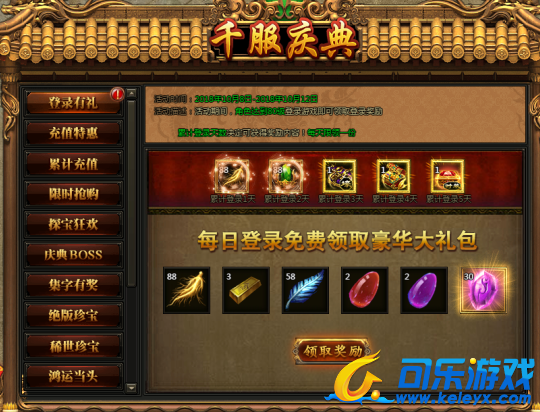 活动规则:活动期间,玩家登陆游戏即可领取豪华大礼包,累计登录天数决定可获得奖励内容!每天限领一份!