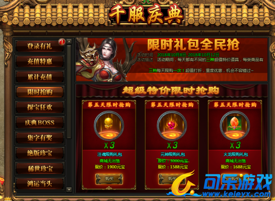 活动规则:活动期间,每天都有不同的三种超值特价道具,每类商品有三档每天限购一次!超值打折,重度优惠,机会不容错过~