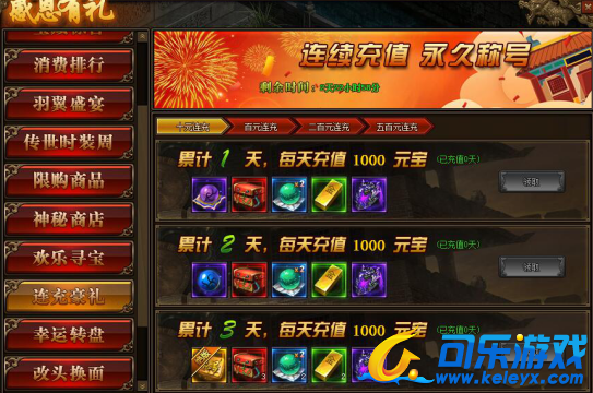 2.累积充值达到三天,奖励翻倍领,更可领取稀有称号(称号可淬炼)!