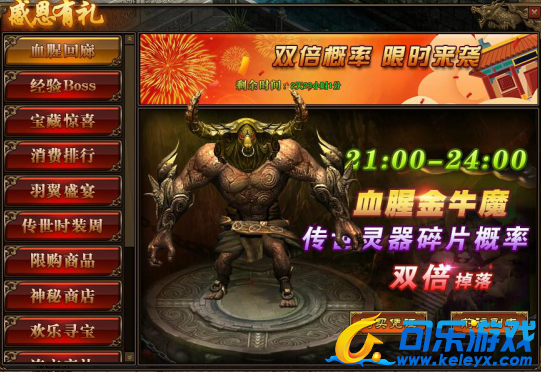 1. 活动期间,玩家参与“多人副本-血腥回廊”,获得“传世灵器碎片”的概率翻倍;