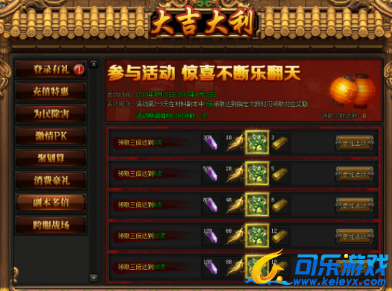 活动规则:活动第2-3天在材料副本中3倍领取达到指定次数时可领取对应奖励,活动期间每档只可领取一次