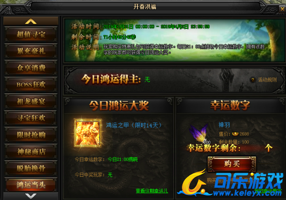 活动说明 : 玩家购买特惠礼包可活动幸运数字。每日21:00抽取今日幸运数字,拥有该数字的玩家即可获得今日鸿运大奖。