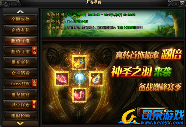 1,活动说明:活动期间,高转武器、首饰概率翻倍,神圣之羽限时抽取!
