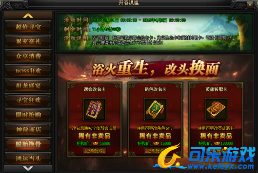 活动说明 : 活动期间,玩家可购买角色改名卡和英雄转职卡,每张卡限购1次。机会难得请珍惜这次来之不易的机会哦!
