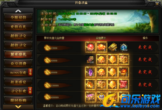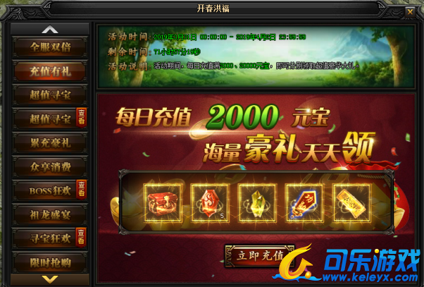 活动说明:活动期间,每日充值满2000、20000元宝!还能领取超值豪华大礼