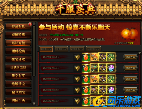 活动规则:活动期间,每日充值累计充值指定元宝便可获得超级豪华奖励,还有火龙结晶哦!