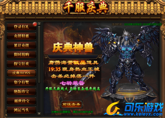 活动内容:活动期间,每晚19:35分热血王城(92,92)出现庆典BOSS,击杀必掉落一件七转装备。掉落物品可自由拾取。BOSS需在20分钟内击杀。开服天数越大,高转装备爆率越高。