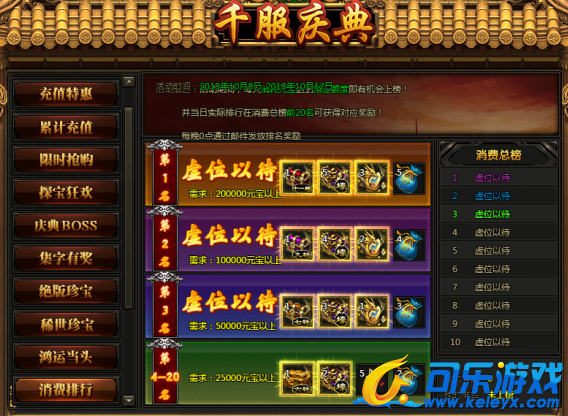 活动内容:活动期间,每天消费元宝达到指定额度即可上榜获得排名奖励,排名前三的玩家可以得到至尊屠龙碎片哦!每天0点邮件发送奖励!