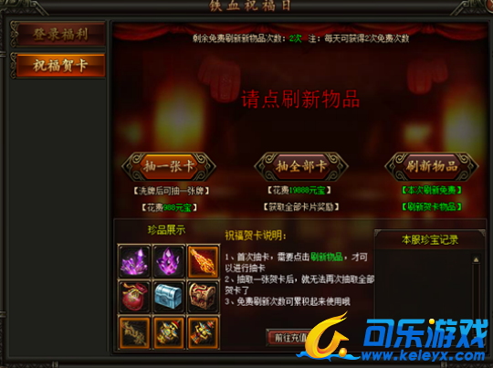 活动详情:首次抽卡,需点击刷新物品才可进行抽卡。玩家每天可获得2次免费刷新次数,贺卡洗牌后可选择抽取一张获得奖品,或直接获得全部贺卡,若不满意本次物品也可直接刷新物品获得新的贺卡。