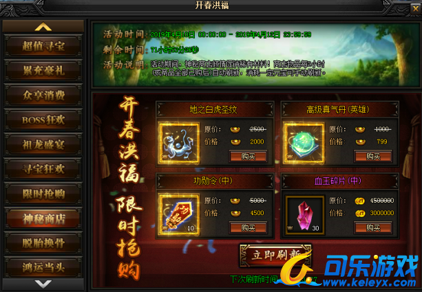 活动说明 : 活动期间,神秘商店倾情促销稀有材料!商店物品每2小时自动刷新(或全商品全部已购后),消耗一定元宝可手动刷新。