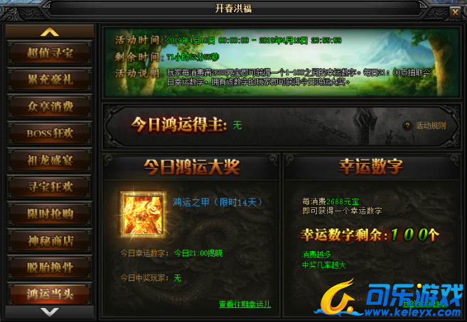 活动说明 : 玩家每消耗2688元宝即可获得一个1-100之间的幸运数字。每日21点抽取今日幸运数字,拥有该数字的玩家即可获得今日鸿运大奖。