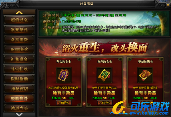 活动说明 : 活动期间,玩家可购买角色改名卡和英雄转职卡,每张卡限购1次。机会难得请珍惜这次来之不易的机会哦!