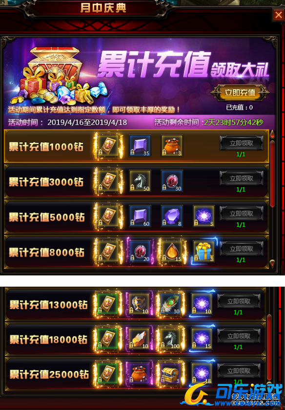 活动内容:玩家在活动时间内,累计充值达到一定钻石即可获得丰厚礼品,BOSS卡、紫色神灵随机箱、创世粒子等你来拿!